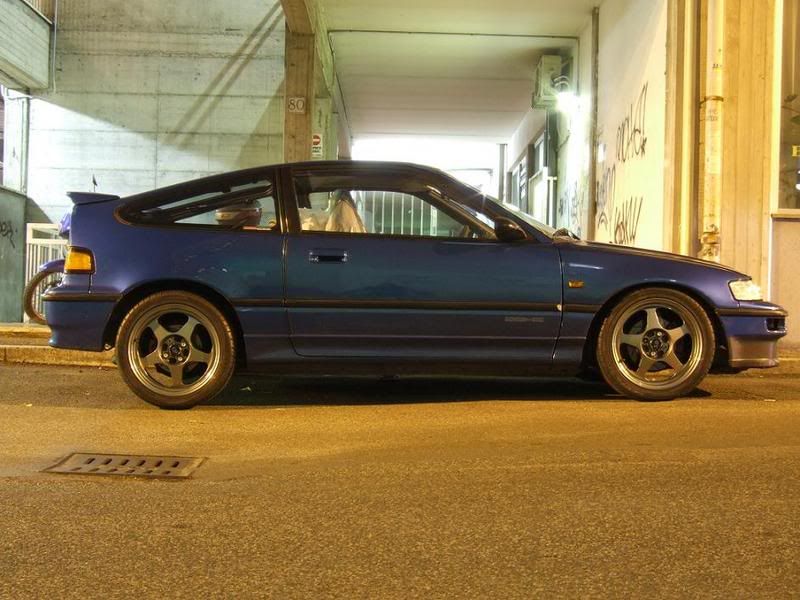 a quel punto sono passato alle macchine sapendo che non poteva mai essere come le moto ...........ma ho cercato una macchina potente e che costava poco da usata e mi sono buttato su una honda crx vtec 1600 cc aspirata 150 hp ........... dove avevo trapiantato il motore della honda integra type r 1800 da 190 hp che con del soft tuning avevo fatto portare a quota 200 hp + o - su una macchina che pesava 1030 kg ma che io stavo tranquillamente sui 950 poichè l'avevo svuotata un bel pò........... un bel missiletto ( mai paragonabile ad una moto certo , anche se il motore spinge fortissimo agli alti abbastanza simile ad una moto , anche se il sound non gli faceva invidia ad una moto , avevo montato il terminale arrow in titanio della cbr 954 :lol: ....